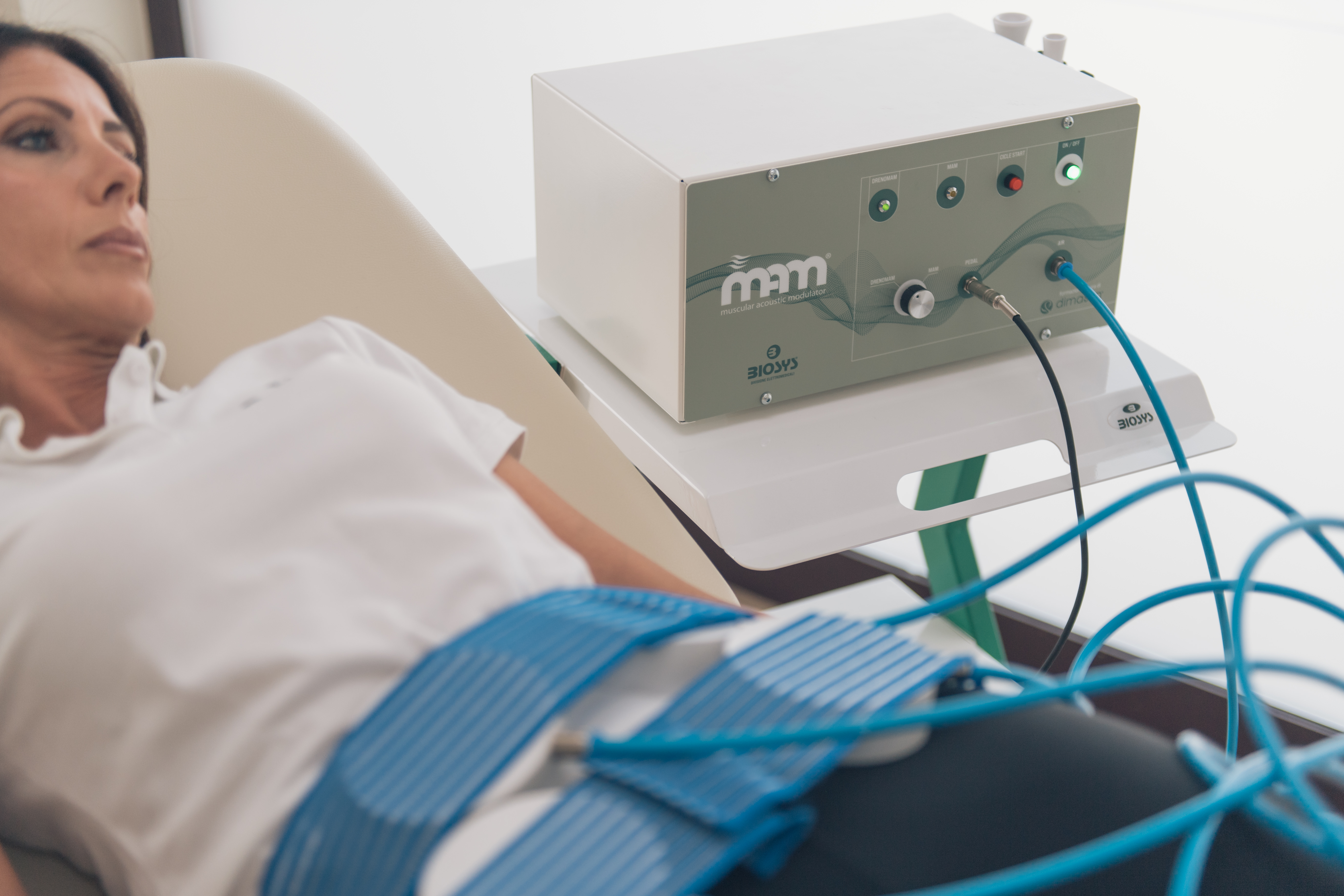 Il dispositivo MAM®, tramite un manipolo ergonomico, trasmette le onde acustiche MAM (modulate in potenza e frequenza 0-2 bar, 0-50 Hz) per il trattamento del dolore che può essere eseguito su tutto il corpo.